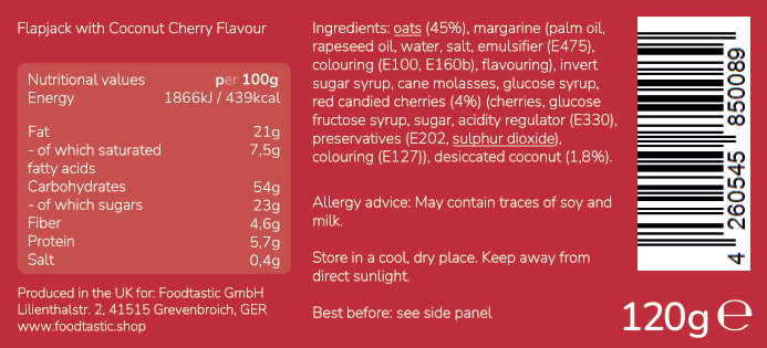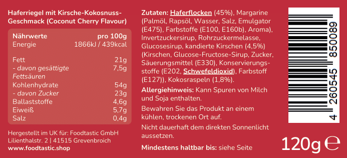Haferflocken (45%), Margarine (Palmöl, Rapsöl, Wasser, Salz, Emulgator (E475), Farbstoffe (E100, E160b), Aroma), Invertzuckersirup, Rohrzuckermelasse, Glucosesirup, kandierte Kirschen (4,5%) (Kirschen, Glucose-Fructose-Sirup, Zucker, Säuerungsmittel (E330), Konservierungsstoffe (E202, Schwefeldioxid), Farbstoff (E127)), Kokosraspeln (1,8%).