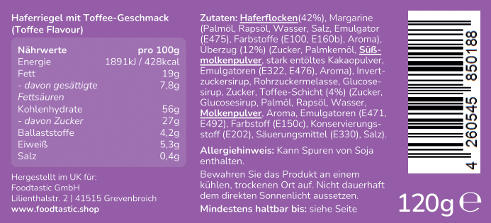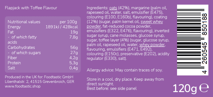 Haferflocken (42%), Margarine (Palmöl, Rapsöl, Wasser, Salz, Emulgator (E475), Farbstoffe (E100, E160b), Aroma), Überzug (12%) (Zucker, Palmkernöl, Süßmolkenpulver,
