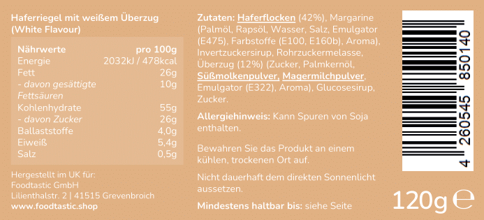 Haferflocken (42%), Margarine (Palmöl, Rapsöl, Wasser, Salz, Emulgator (E475), Farbstoffe (E100, E160b), Aroma), Invertzuckersirup, Rohrzuckermelasse, Überzug (12%) (Zucker, Palmkernöl, Süßmolkenpulver, Magermilchpulver, Emulgator (E322), Aroma), Glucosesirup,